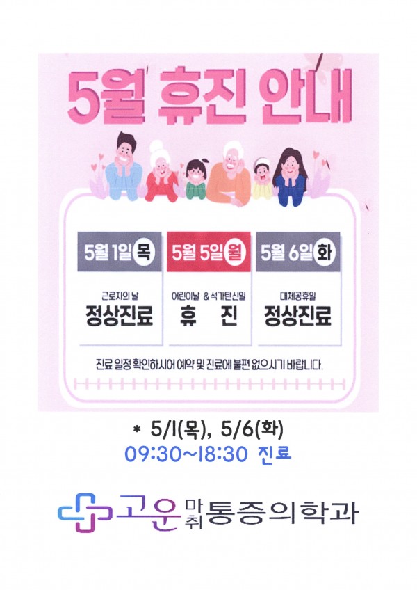 2025년 5월 1일(목)/근로자의날 : 정상진료 (09:30~18:30)