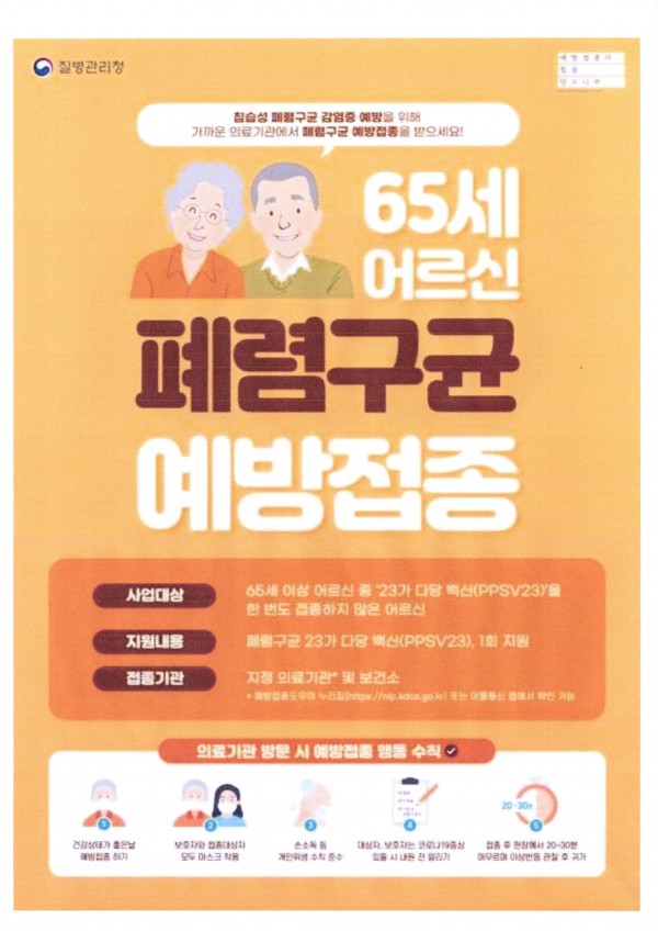 65세 이상 어르신 폐렴접종 안내 페이지 정보 작성자 고운통증의학과 작성일25-05-16 16:54 조회1,011회 댓글0건 이전글 다음글 목록 본문 65세 이상 어르신 무료 폐렴구균 접종이 가능합니다. (1회 지원) 댓글목록 등록된 댓글이 없습니다. 이전글 다음글 목록