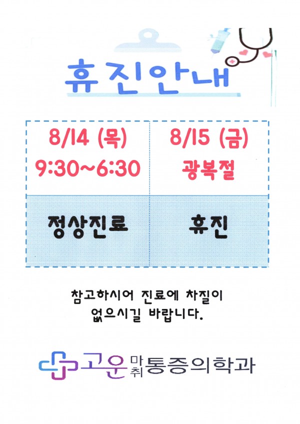 2025년 8월14일(목)/정상진료 : 09:30~18:30